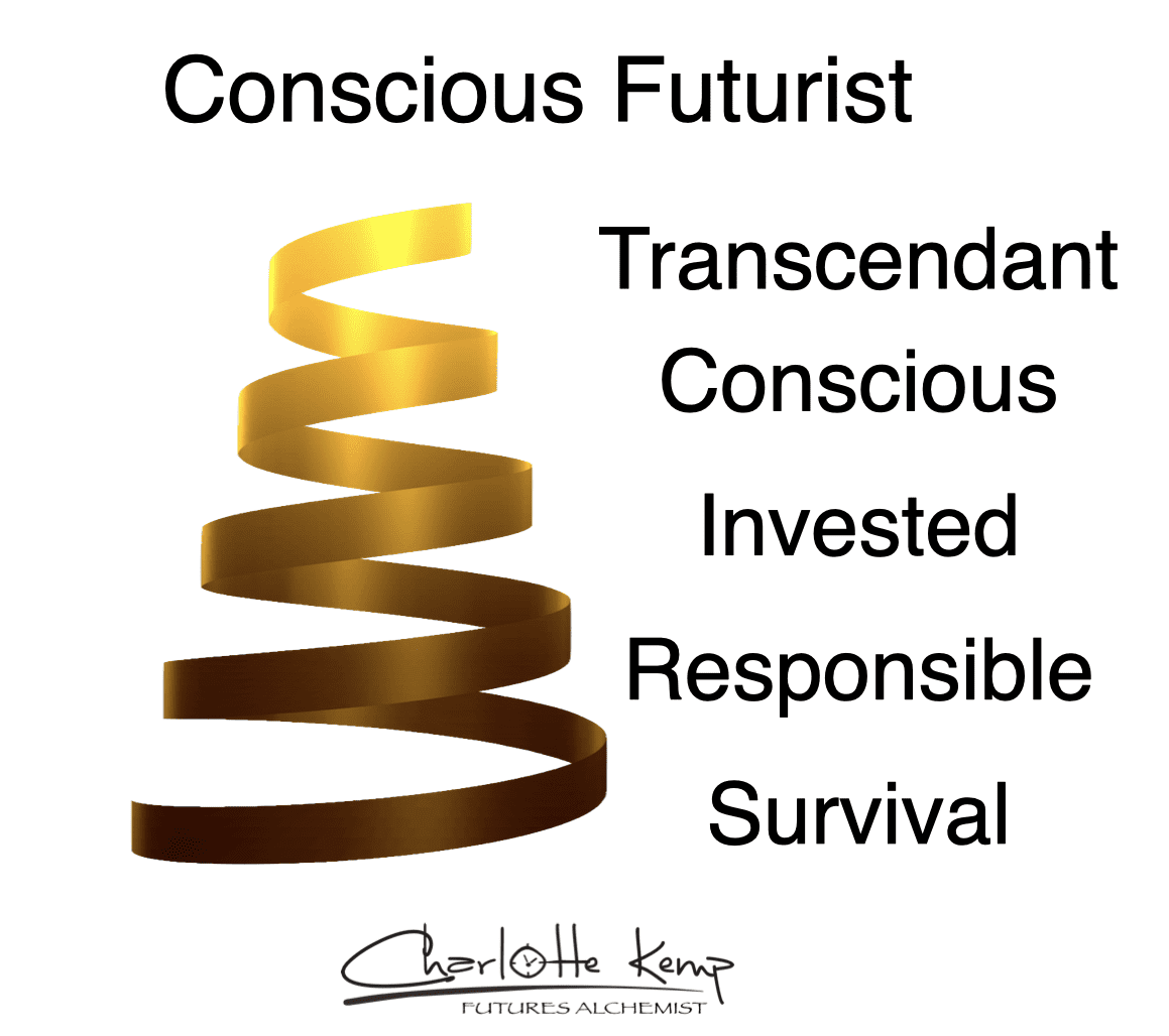 The Conscious Futurist model demonstrates how people can move from the lower levels of a spiral (below the line) to the higher levels of being a conscious futurist. It implies increased awareness of wider circles of stakeholders and longer periods of time into the future.